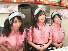 Asian busty teen trio flashing tits at the fast food