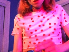 Redhead ladyboy in black corset jerks off her trimmed cock